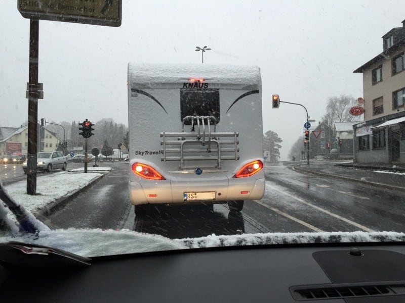 Hinterm Steuer stellte sich dann schnell das vertraute Womo-Fahrgefühl ein und ich hätte wahrscheinlich ein fettes Grinsen auf dem Gesicht gehabt, wenn nicht die Straßenverhältnisse und zu allem Überfluss auch noch ein Rettungswagen von hinten doch für ein eher konzentriertes Gesicht sorgten. Schließlich wollte ich nicht direkt auf der ersten Fahrt, noch dazu mit Sommerreifen, einen Unfall bauen!