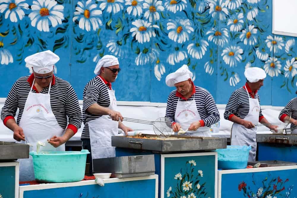Am Hauptabschnitt der Promenade ist Festa della Primavera. Männer in blau-weißen Ringelshirts mit Kochmütze und Schürze frittieren, was das Zeug hält Muzen ähnliche Teigmasse die als Dolci serviert wird, also gezuckert. Es gibt aber auch eine Variante, die Salati betitelt ist und, wie uns nach einer Kostprobe dämmert, nichts mit Salat, dafür aber um so mehr mit gesalzen zu tun hat. Und in der Teigmasse sind noch etwas grünes (Spinat?) und Fisch zu sehen und zu schmecken. Mjam! Das beste von allem: Es wird wie bei der Volksspeisung an alle ausgegeben, die sich in die langen Schlangen einreihen. Bezahlt wird nicht!