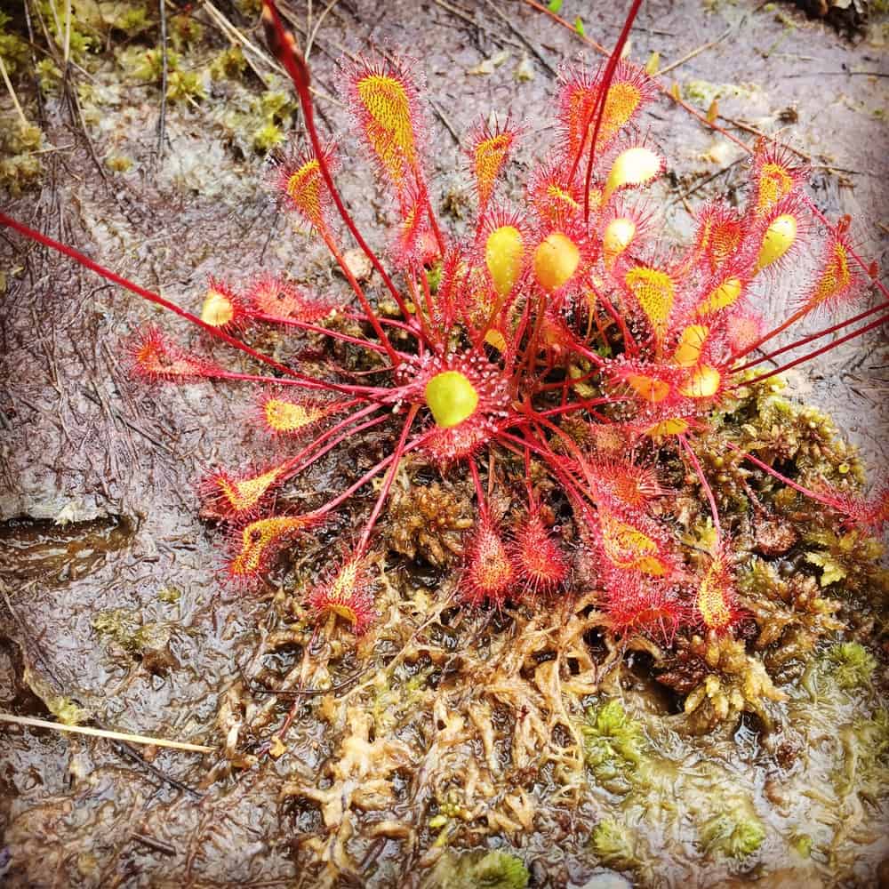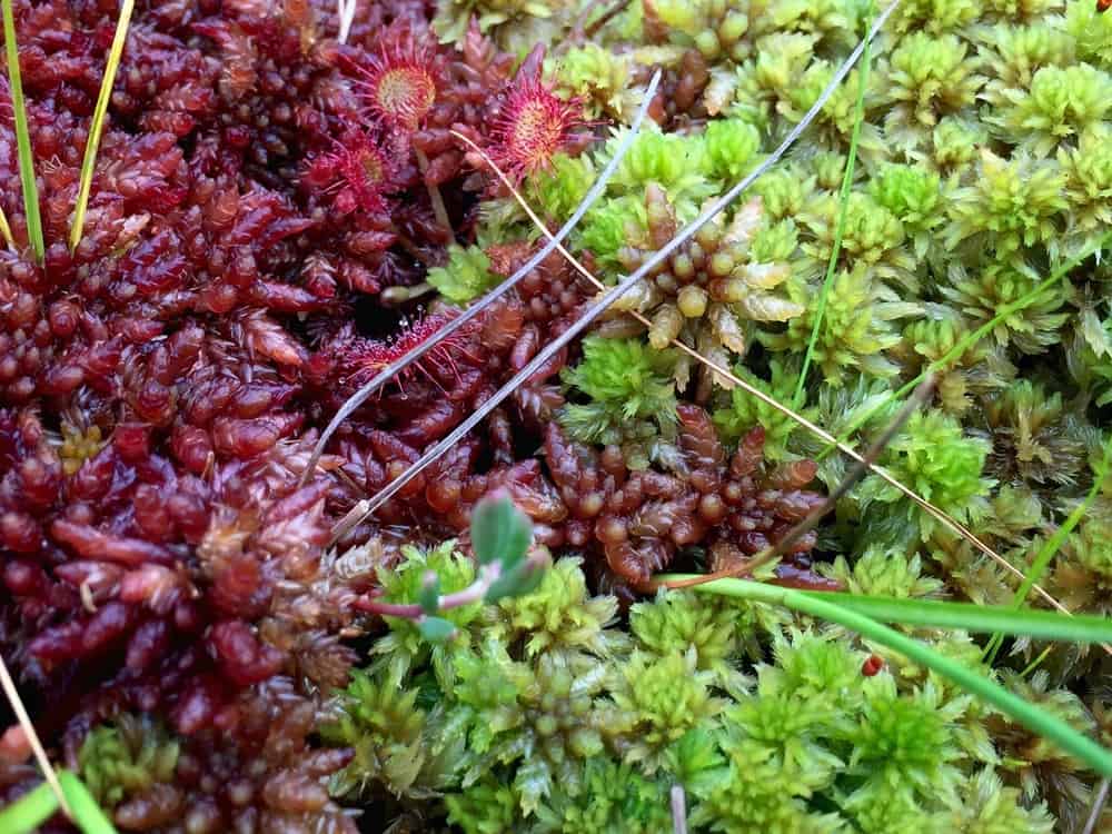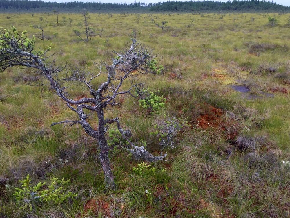 Auch der Weg zum See ist auf den letzten Metern vorbildlich mit einem breiten Steg durch die Sumpflandschaft erschlossen. Annette bemerkt treffend: “Wie Yellowstone, nur dass nichts dampft und stinkt.” Der eigentlich Star dieser Landschaft ist aber nicht die große Weite und eigentlich auch nicht der See, sondern vielmehr die Moorvegetation am Wegesrand. Da gibt es wieder viel zu bestaunen und wegzufotografieren, was wir als botanische Vollnieten nicht benennen, aber um so mehr bestaunen können. Und irgendwie ist dies auch bei dem tristen Nieselregen, der mittlerweile eingesetzt hat, auf seine eigene Art spektakulär. Uns gefällt’s!