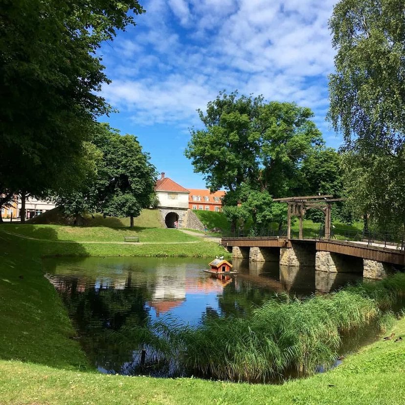 Von Fredrikstad wissen wir nur, dass die Altstadt Gamlebyen wirklich sehenswert sein soll. Und tatsächlich ist die ehemalige Festungsanlage eine kleine Zeitreise. Breite Straßen mit hubbeligem Kopfsteinpflaster und alte Häuschen, die größtenteils schön gestrichen und teilweise mit üppigen Kletterrosen bewachsen sind. Erinnert in seiner Art ein bisschen an Altstädte in Masuren.