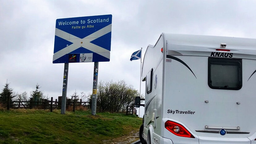 Nach wenigen Meilen haben wir die schottische Grenze erreicht. Und das obligatorische Foto vor dem „Welcome to Scotland“-Schild macht vor uns schon ein Auktionator indem er die komplette Spur blockiert. Der weiß, wie‘s geht!