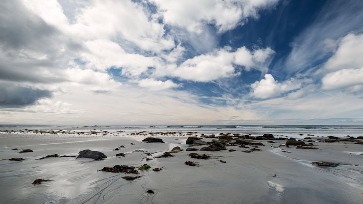 So sehr, dass wir gegen Mittag zu einem längeren Strandspaziergang aufbrechen. Auch, wenn es noch bedeckt ist, sehen wir in der Ferne doch größere blaue Streifen am Stück. Die Sonne hat es noch nicht bis zu uns geschafft, aber an den nördlicher gelegenen Küstenstreifen sehen wir den Strand hellgelb leuchten.
