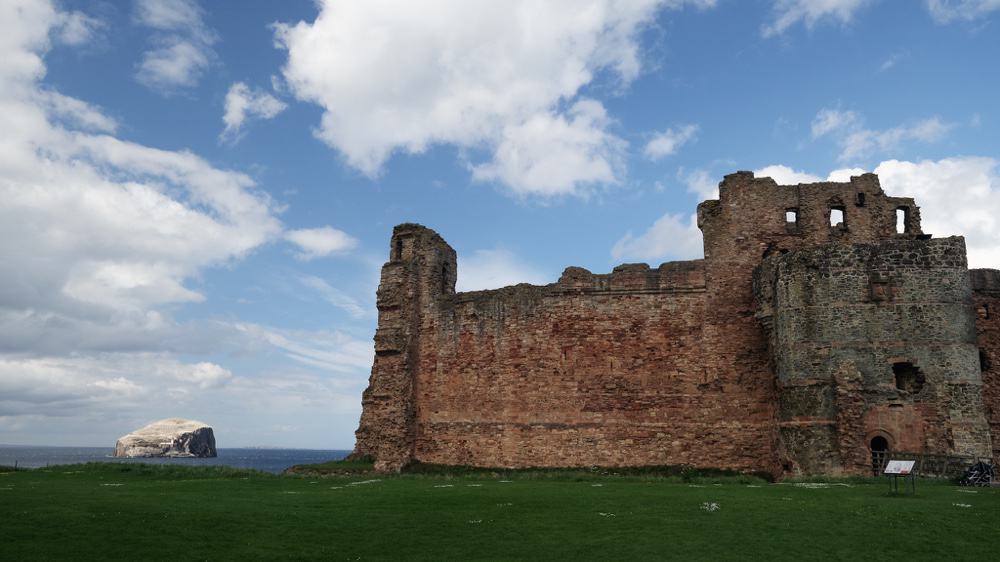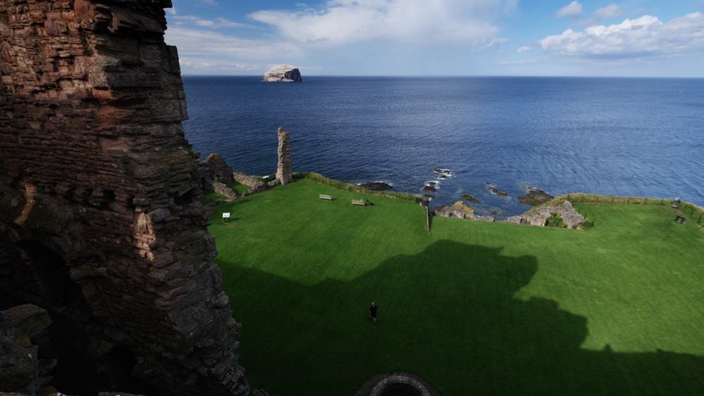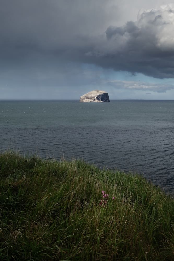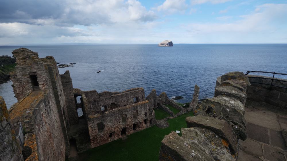 Dafür gibt es bei der Weiterfahrt aber eine doll beeindruckende Lichtstimmung als wir zum nächsten Ziel fahren. Vor dem Tantallon Castle sieht man schon auf dem Meer den Bass Rock weiß leuchten. Also nicht so weiß wie die White Cliffs of Dover, sondern weiß wie Vogelkacke! Auf der Insel brüten Tausende von Basstölpeln und entsprechend zugeschissen ist das ganze Eiland dann auch. Sieht aber vor einem schwarzen Himmel geradezu dramatisch gut aus!
