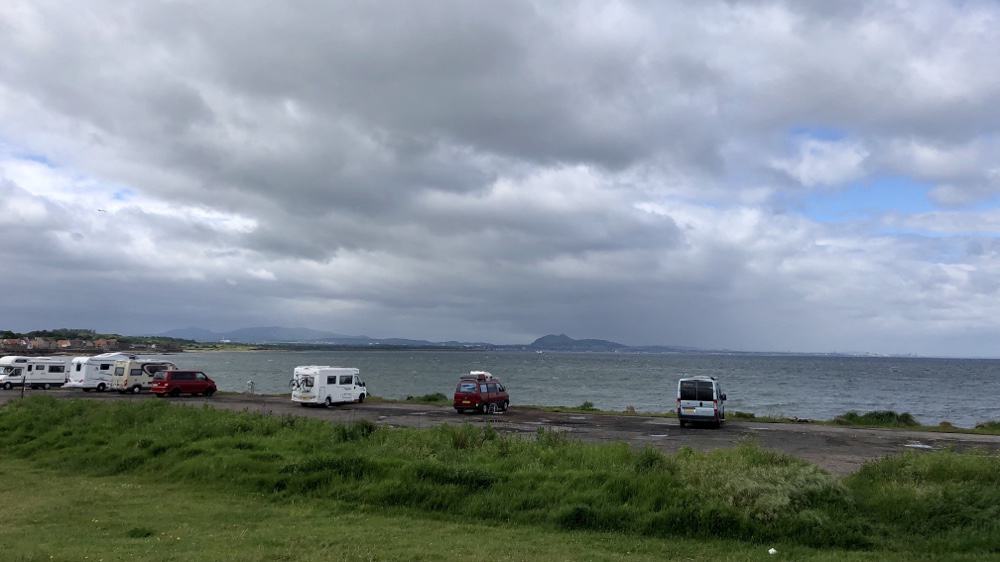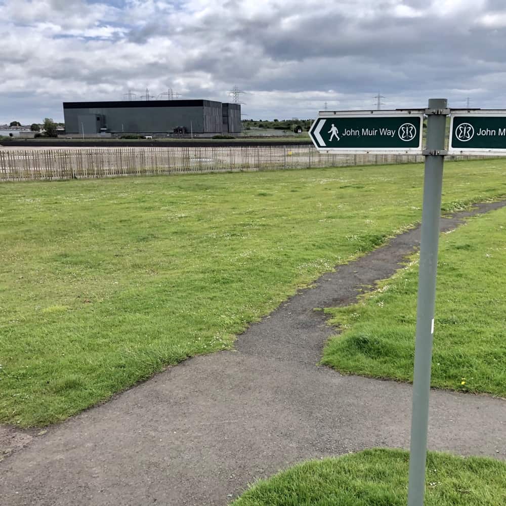 Wir machen eine kleine Runde mit den Hunden und stellen fest, dass der hier lang führende John-Muir-Weg den Mitbegründer der amerikanischen Nationalparks (der im Nachbarort Dunbar geboren wurde) im Grabe rotieren lassen würde. Schon das Stück gestern durch den Ort war alles andere als landschaftlich schön. Aber die Runde heute führt uns dann noch an einem trostlosen Kraftwerk vorbei. Klar, muss es auch geben, aber für einen Wanderweg wirklich nicht toll.