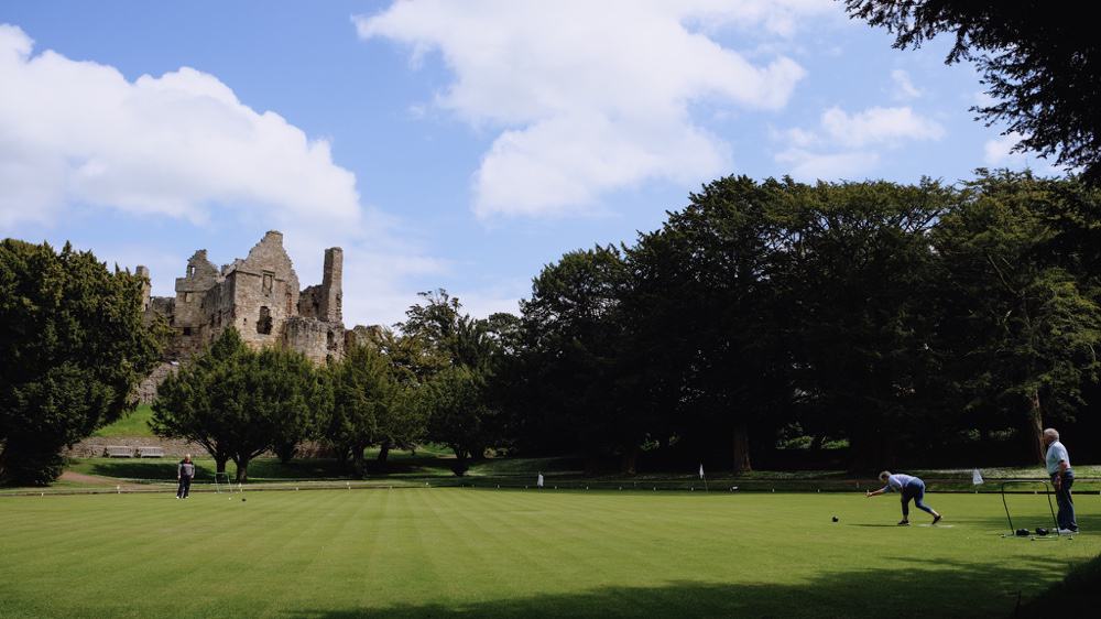Das ganze ist wirklich ein kleiner Abenteuerspielplatz. Und als wir die Burg verlassen, gibt es noch einen kleinen Bonus: Auf einer riesigen quadratischen Rasenfläche spielen 3 ältere Herrschaften Bowling. Also nicht so wie man das bei uns kennt. Sondern eher eine Art britisches Boule. Und es ist beeindruckend zu sehen, wie treffsicher das alte Ehepaar die Kugeln bis an die Zielkugel heranrollen kann. Respekt!