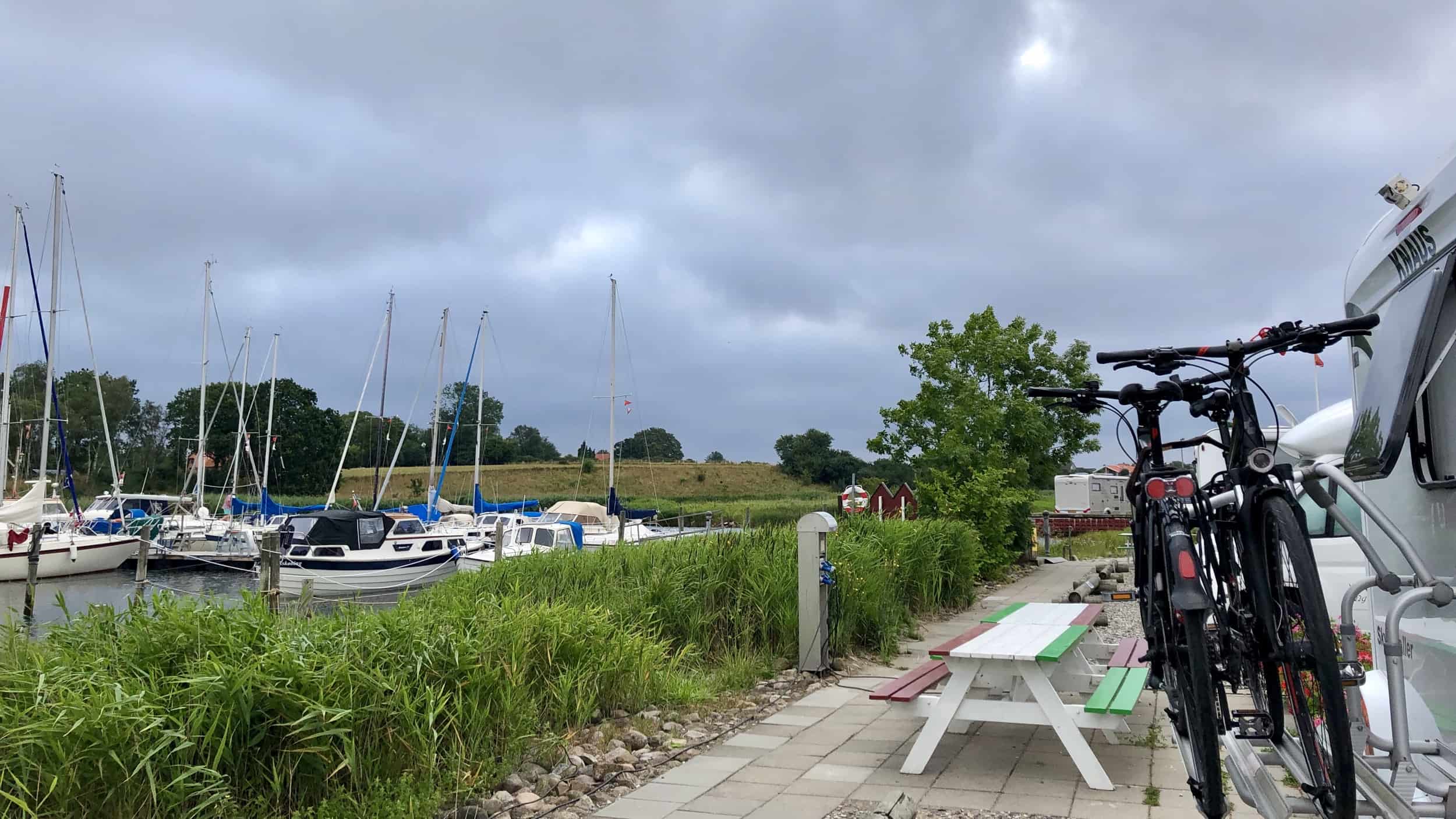 Auf größtenteils schnurgeraden Straßen erkunden wir die Gegend östlich von Sakskøbing. Zunächst fahren wir vom Stellplatz ein paar Kilometer in die Stadt und von dort wieder auf deren anderen Seite des Wassers zurück bis wir auf der anderen Seite unseren Hafen sehen. Man könnte glatt rüberspucken!