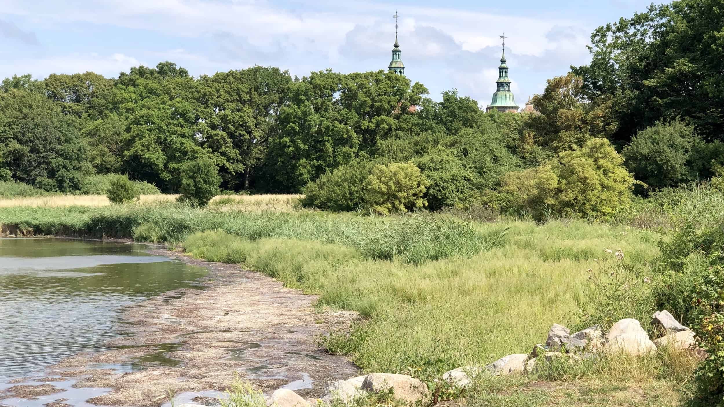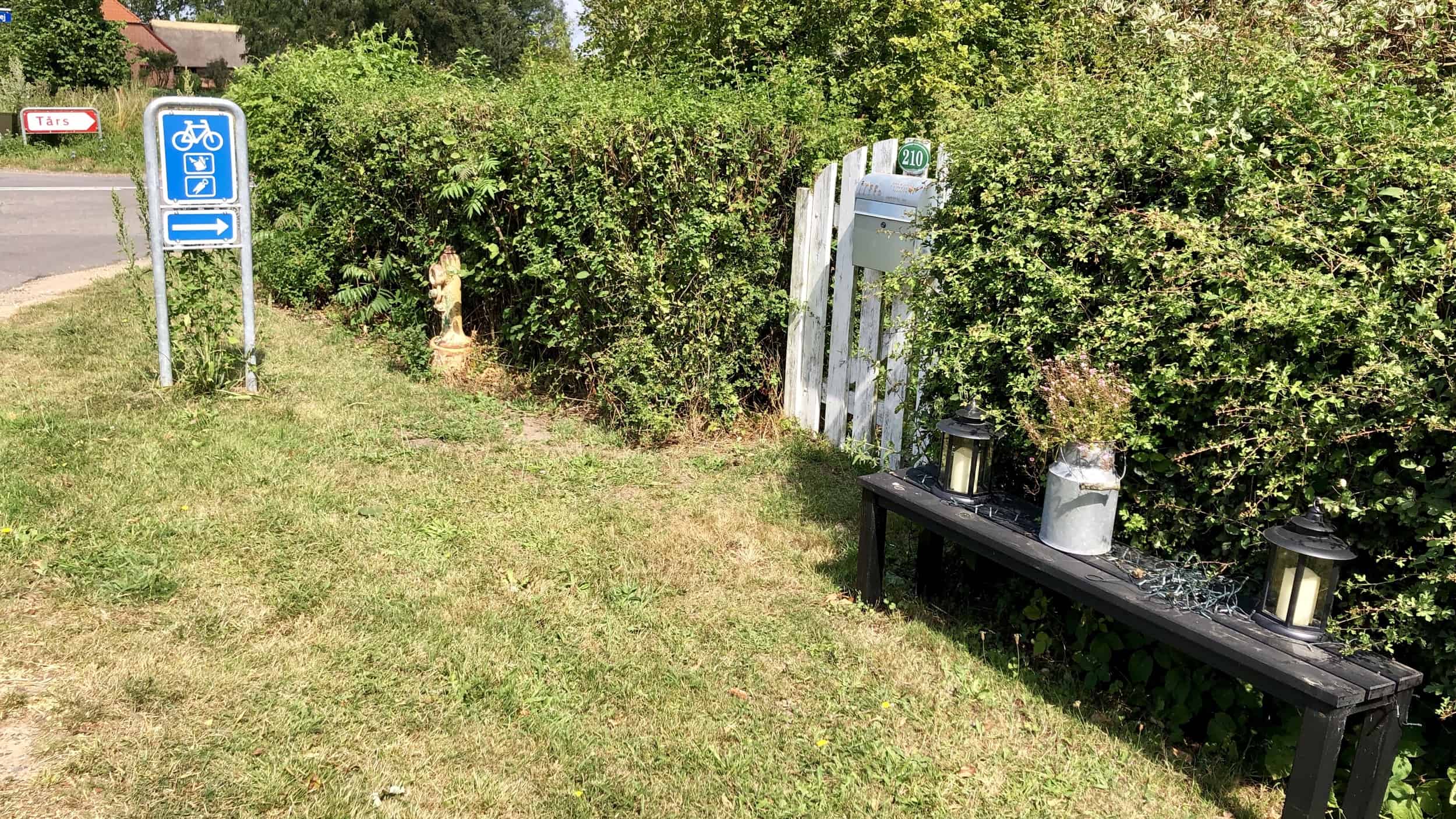 Während der Kro wirklich reinlassend aussieht ist vom Schloss nichts zu sehen. Wo soll das denn sein? Wir gehen hinter dem Kro noch ein Stückchen weiter und entdecken eine Badewiese. Allerdings mit Hinweisschild. „Privat“ verstehen wir ja, aber was heißt „Færdsel til fods“? Gut, dass es Google-Translate gibt! Bedeutet wohl „Reisen zu Fuß“. Wir dachten schon es wäre ein rüder dänischer Fluch…