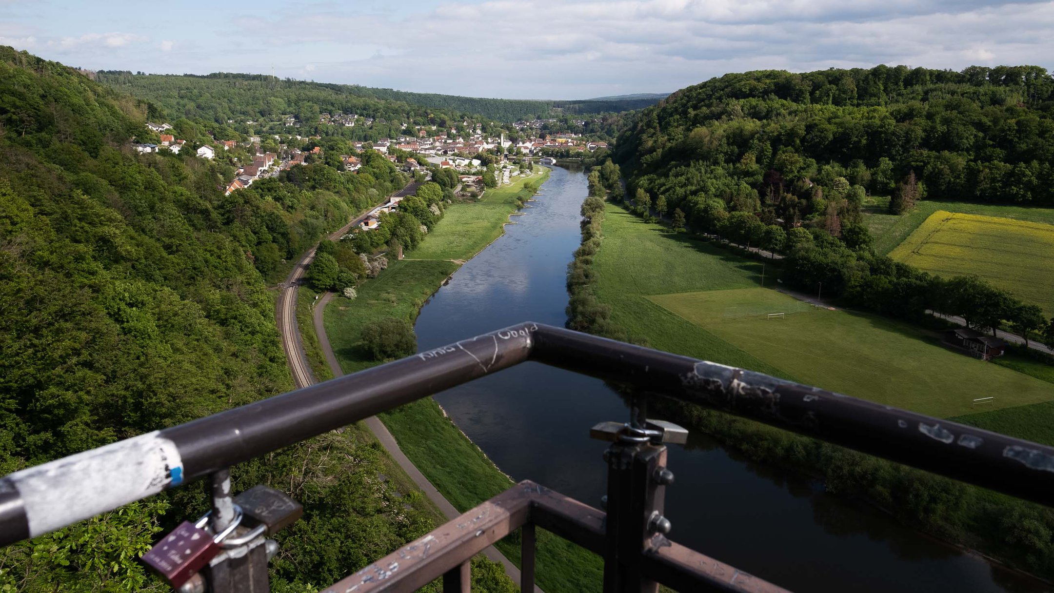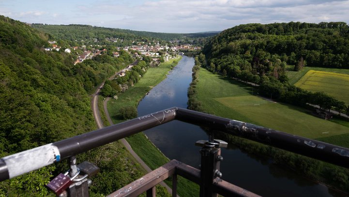Der Skywalk ist dann mit seinem Lochgitter leider nicht hundefreundlich. Also muss einer von uns hundesitten, während der/die andere den Ausblick auf das Wesertal genießen darf. Der gefällt uns auch wirklich gut. Man kann in die eine Richtung Bad Karlshafen sehen und in die andere unseren Stellplatz. Nur das MoMo leider nicht, denn das ist hinter Bäumen versteckt.