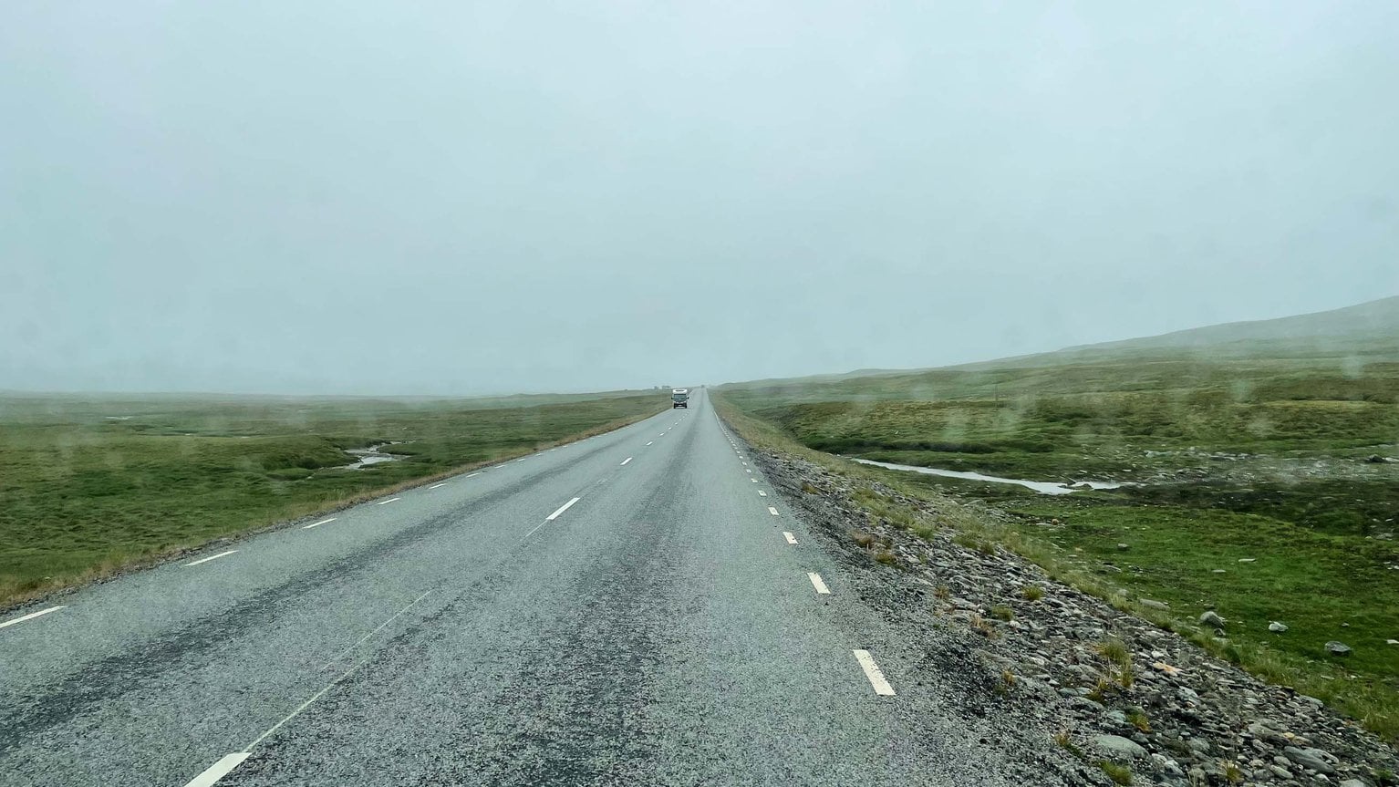 Am großen Parkplatz des Stekenjokk, kurz hinter der Passhöhe, müsste es normalerweise wirklich toll aussehen. Ich steige kurz zum Fotografieren aus – Annette ist da schon schlauer und sieht sich das ganze trübe Schauspiel aus dem warmen MoMo an.