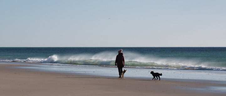 Am großen Parkplatz am Kap angekommen, machen wir den kurzen Spazierweg zum Aussichtspunkt. Auch hier gilt: Top-Aussicht über die weite Bucht und bis zu den Kanalinseln. Nur wärmer dürfte es gerne sein. Wir erbarmen uns, denn Toffi schlottert jämmerlich, während wir gut eingemummelt die Aussicht genießen.