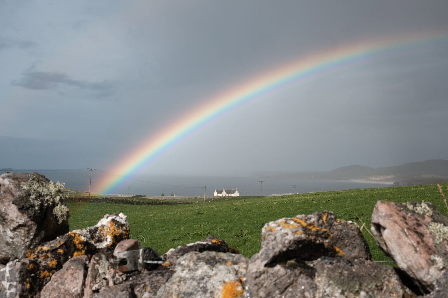 Das Wetter ist heute deutlich durchwachsener als gestern. Es liegt Regen in der Luft und auf dem Weg Richtung Westen sehen wir einen Regenbogen über der Bucht. Das Verrückte ist nur: Er ist total beständig und nimmt nur noch an Leuchtkraft zu. Wir schießen Foto um Foto in der Gewissheit, dass so ein Regenbogen schnell wieder verschwunden ist. Aber dieser Regenbogen steht am Himmel, als sei er für den Tag heute gebucht und macht keine Anstalten zu verschwinden. Faszinierend!